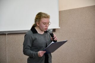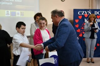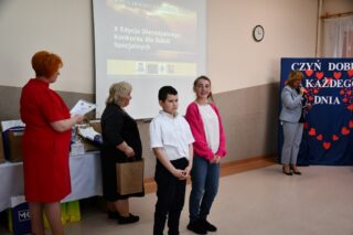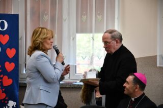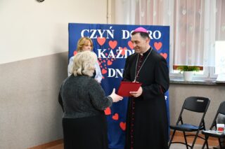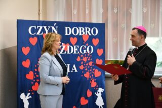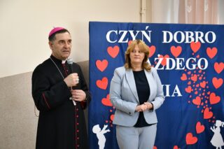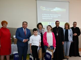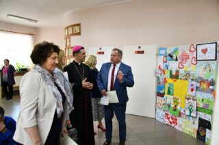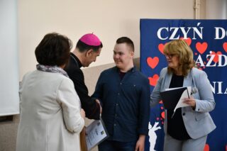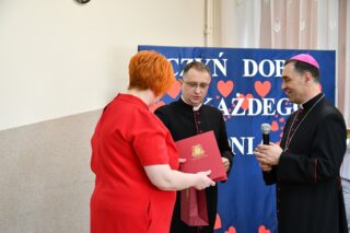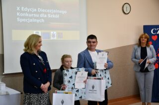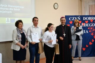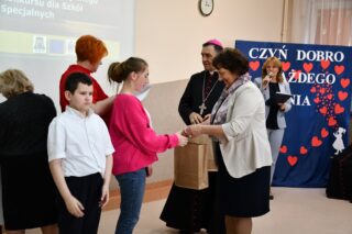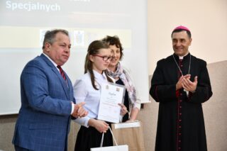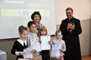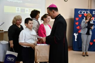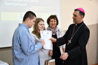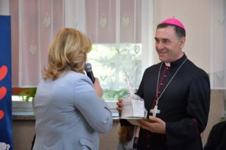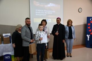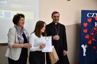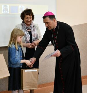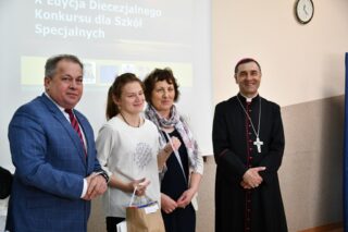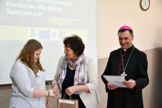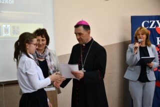 Dyrektor szkoły podziękował wszystkim organizatorom oraz osobom zaangażowanym w przygotowanie i przeprowadzenie konkursu. Słowa wdzięczności wyrazili również zaproszeni goście. Bp Piotr Sawczuk wręczył upominki zarówno dyrektor Beacie Biernat, jak i osobom ją wpierającym: Urszuli Krzymowskiej oraz Grażynie Jarosz.
