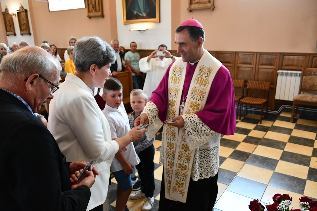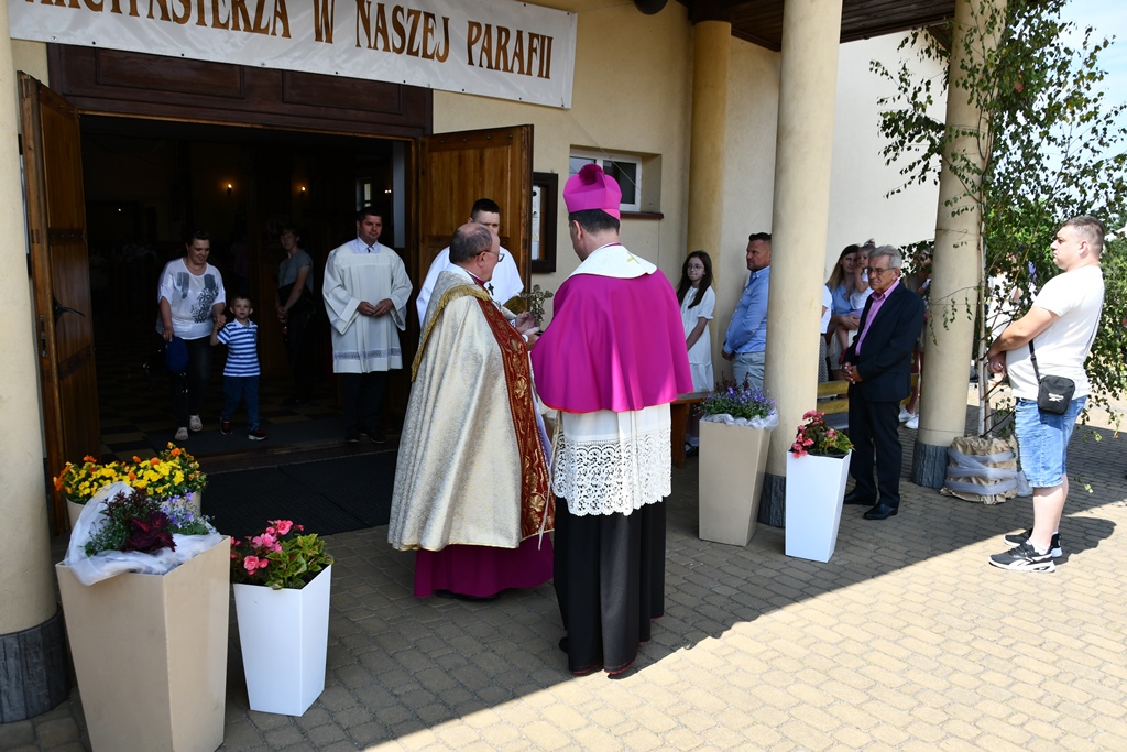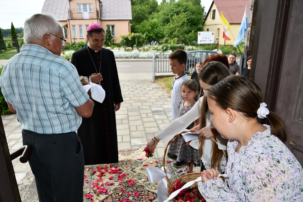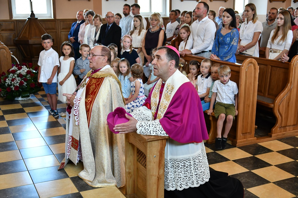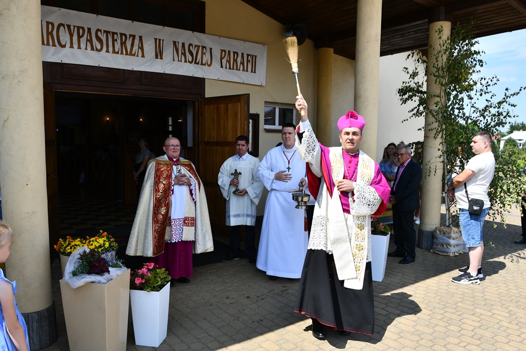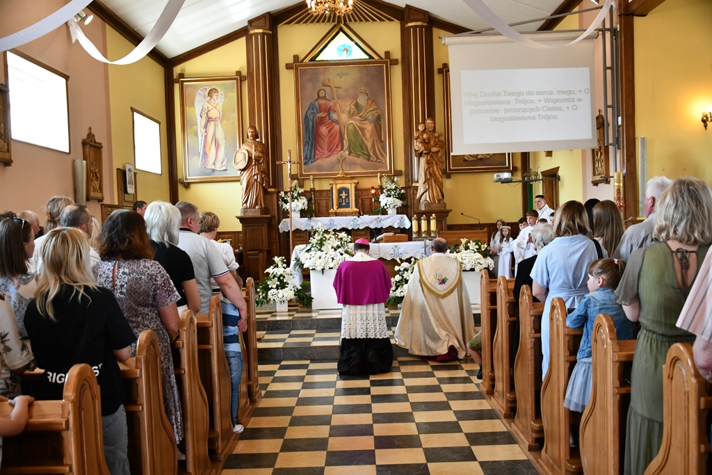 Równie uroczyście powitano biskupa w kościele parafialnym. Ceremonia ingresu zawierała przewidziane obrzędem modlitwy. Po powitaniach proboszcz przedstawił biskupowi w obecności wiernych sprawozdanie z działalności parafii obejmujące czas od poprzedniej wizytacji. Również tutaj biskup przewodniczył Mszy św. i wygłosił homilię. Nawiązał niej do obchodzonej uroczystości Trójcy Świętej. Jest ona okazją do stanięcia wobec najtrudniejszej prawdy o Bogu, wobec tajemnicy Jego wewnętrznego życia, relacji panujących w łonie Trójcy. Prawdę o Trójosobowym Bogu objawił w pełni dopiero Jezus Chrystus. „Nie jesteśmy w stanie zgłębić tajemnicy Boga i Jego wewnętrznego życia. Tym niemniej, choć niewiele rozumiemy, jesteśmy pewni, że tak jest, bo Bóg jest prawdomówny, Chrystus jest prawdomówny, a to On objawił nam Trójcę. Prawda o Bogu Trójjedynym nie jest zatem wymysłem teologów. To Chrystus przedstawił nam Ojca jako początek wszystkiego i źródło miłości. Chrystus wraz Ojcem posłał Ducha Świętego, który nas uświęca. To dzięki Chrystusowi wiemy, że Bóg jest wspólnotą Trzech Osób, które się miłują, są złączone ze sobą w doskonałej jedności” – powiedział.