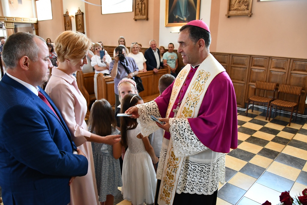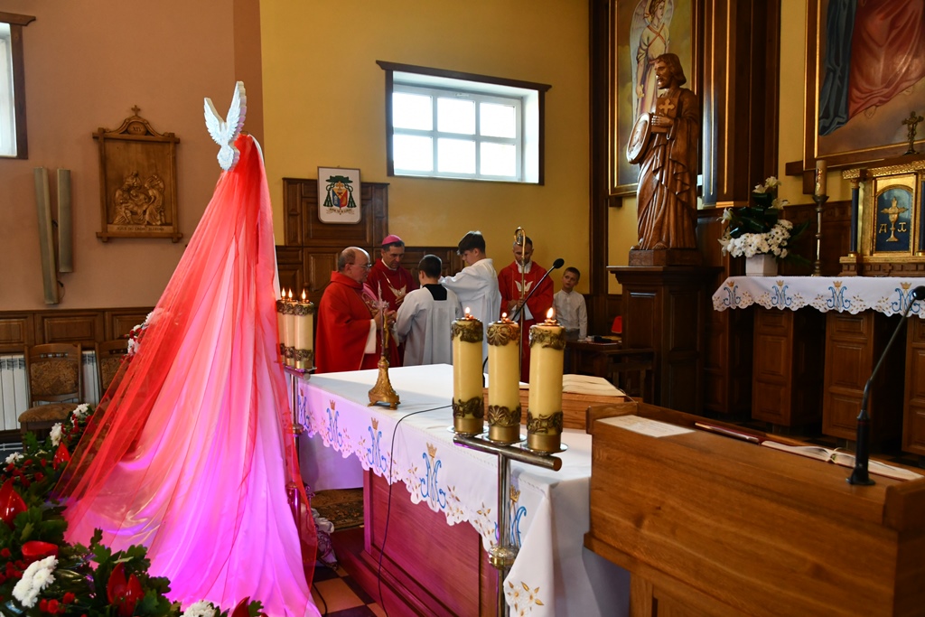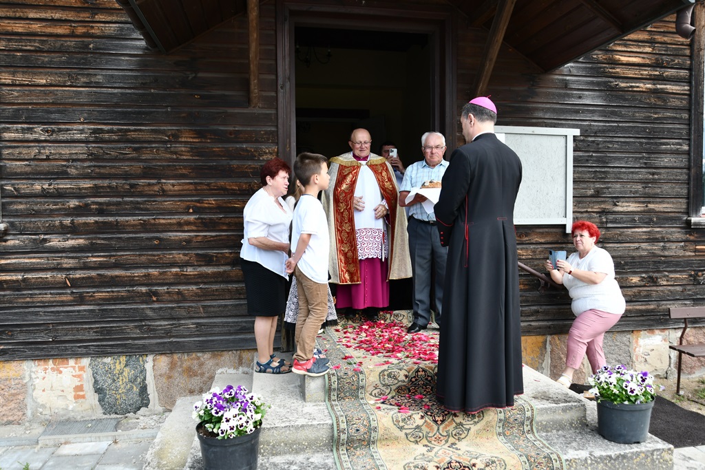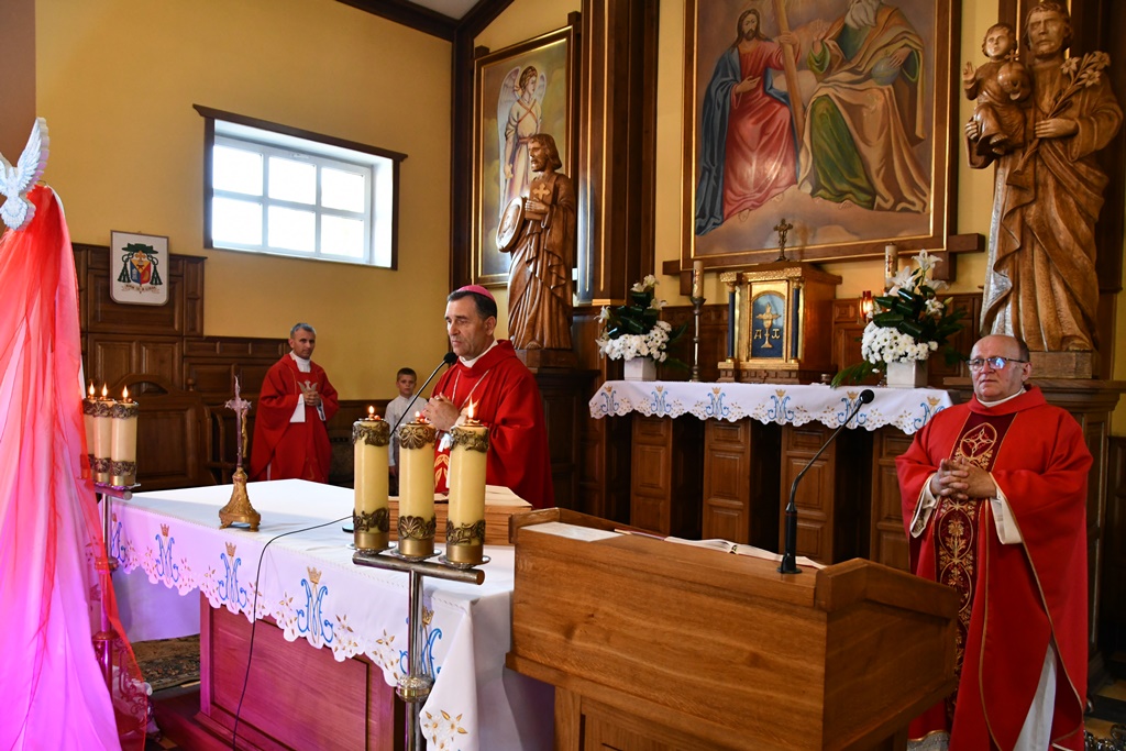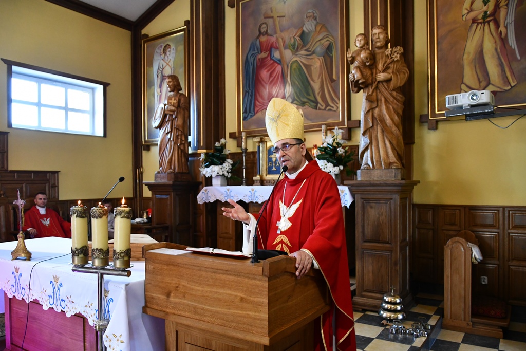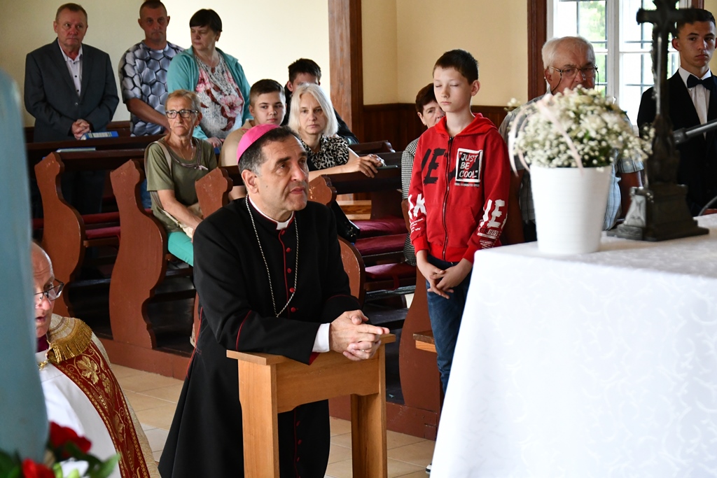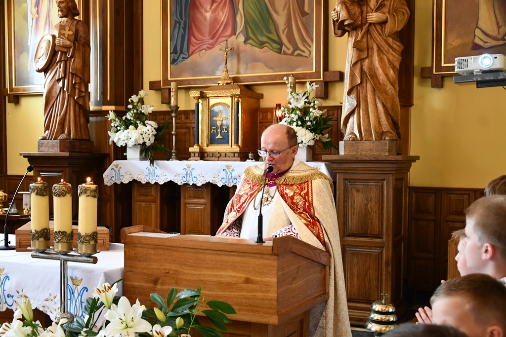 Równie uroczyście powitano biskupa w kościele parafialnym. Ceremonia ingresu zawierała przewidziane obrzędem modlitwy. Po powitaniach proboszcz przedstawił biskupowi w obecności wiernych sprawozdanie z działalności parafii obejmujące czas od poprzedniej wizytacji. Również tutaj biskup przewodniczył Mszy św. i wygłosił homilię. Nawiązał niej do obchodzonej uroczystości Trójcy Świętej. Jest ona okazją do stanięcia wobec najtrudniejszej prawdy o Bogu, wobec tajemnicy Jego wewnętrznego życia, relacji panujących w łonie Trójcy. Prawdę o Trójosobowym Bogu objawił w pełni dopiero Jezus Chrystus. „Nie jesteśmy w stanie zgłębić tajemnicy Boga i Jego wewnętrznego życia. Tym niemniej, choć niewiele rozumiemy, jesteśmy pewni, że tak jest, bo Bóg jest prawdomówny, Chrystus jest prawdomówny, a to On objawił nam Trójcę. Prawda o Bogu Trójjedynym nie jest zatem wymysłem teologów. To Chrystus przedstawił nam Ojca jako początek wszystkiego i źródło miłości. Chrystus wraz Ojcem posłał Ducha Świętego, który nas uświęca. To dzięki Chrystusowi wiemy, że Bóg jest wspólnotą Trzech Osób, które się miłują, są złączone ze sobą w doskonałej jedności” – powiedział.