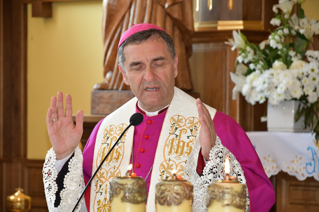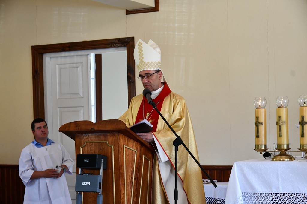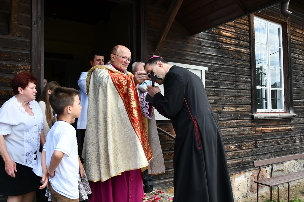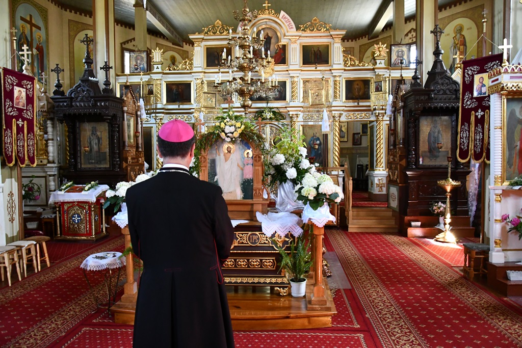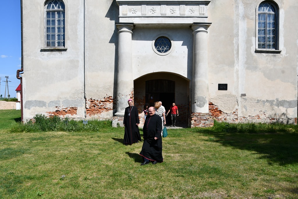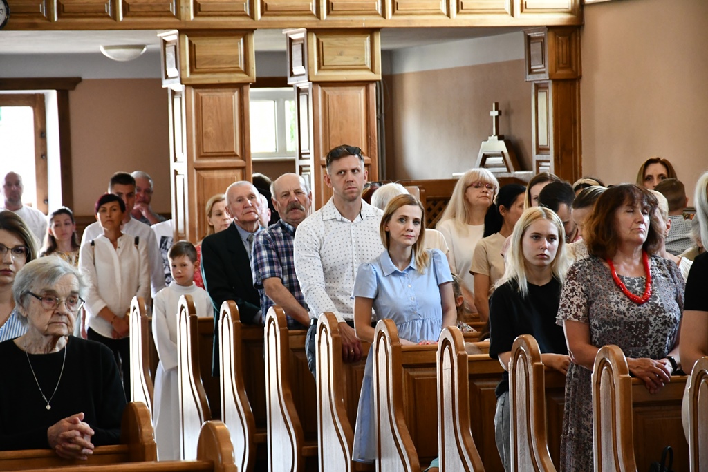 Równie uroczyście powitano biskupa w kościele parafialnym. Ceremonia ingresu zawierała przewidziane obrzędem modlitwy. Po powitaniach proboszcz przedstawił biskupowi w obecności wiernych sprawozdanie z działalności parafii obejmujące czas od poprzedniej wizytacji. Również tutaj biskup przewodniczył Mszy św. i wygłosił homilię. Nawiązał niej do obchodzonej uroczystości Trójcy Świętej. Jest ona okazją do stanięcia wobec najtrudniejszej prawdy o Bogu, wobec tajemnicy Jego wewnętrznego życia, relacji panujących w łonie Trójcy. Prawdę o Trójosobowym Bogu objawił w pełni dopiero Jezus Chrystus. „Nie jesteśmy w stanie zgłębić tajemnicy Boga i Jego wewnętrznego życia. Tym niemniej, choć niewiele rozumiemy, jesteśmy pewni, że tak jest, bo Bóg jest prawdomówny, Chrystus jest prawdomówny, a to On objawił nam Trójcę. Prawda o Bogu Trójjedynym nie jest zatem wymysłem teologów. To Chrystus przedstawił nam Ojca jako początek wszystkiego i źródło miłości. Chrystus wraz Ojcem posłał Ducha Świętego, który nas uświęca. To dzięki Chrystusowi wiemy, że Bóg jest wspólnotą Trzech Osób, które się miłują, są złączone ze sobą w doskonałej jedności” – powiedział.